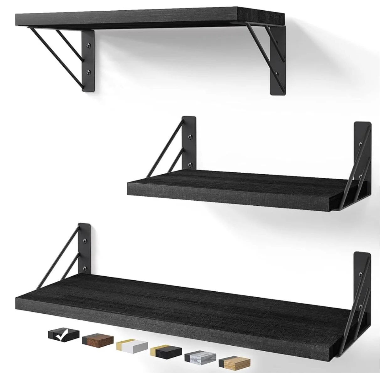 Black floating wall shelves are the ultimate secret weapon for turning empty walls into sleek, functional art. These are made from paulownia wood & industrial metal to give them a rustic vibe. They create ample storage without taking up precious floor space, giving you more room for activities (or just a clean, uncluttered look).