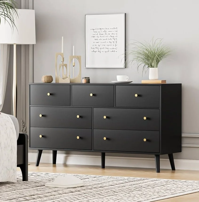 Being crafted from high quality wood while also having solid wood legs ensures it’s durability. The black finish on this dresser gives sophisticated & modern. With its shimmering gold handles, even the most tedious task of sorting laundry feels like a royal affair. Having 7 drawers makes organizing your favorite clothes & accessories super simple!